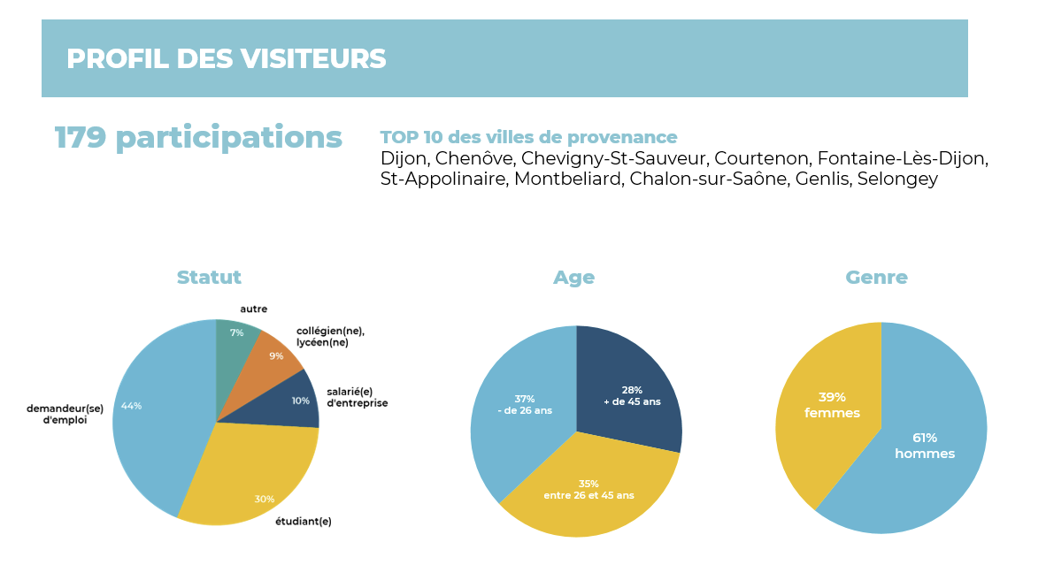 Par ailleurs, 179 visiteurs ont répondu à l’enquête de satisfaction, permettant de dresser un portrait représentatif du public présent et de mieux comprendre ses attentes. Les résultats montrent une grande diversité de profils. Les demandeurs d’emploi constituent la part la plus importante (44%), suivis des étudiants (30%). Le forum a également attiré des salariés (10%) ainsi que des collégiens et lycéens (9%), confirmant son rôle à la fois dans l’insertion professionnelle et l’orientation.